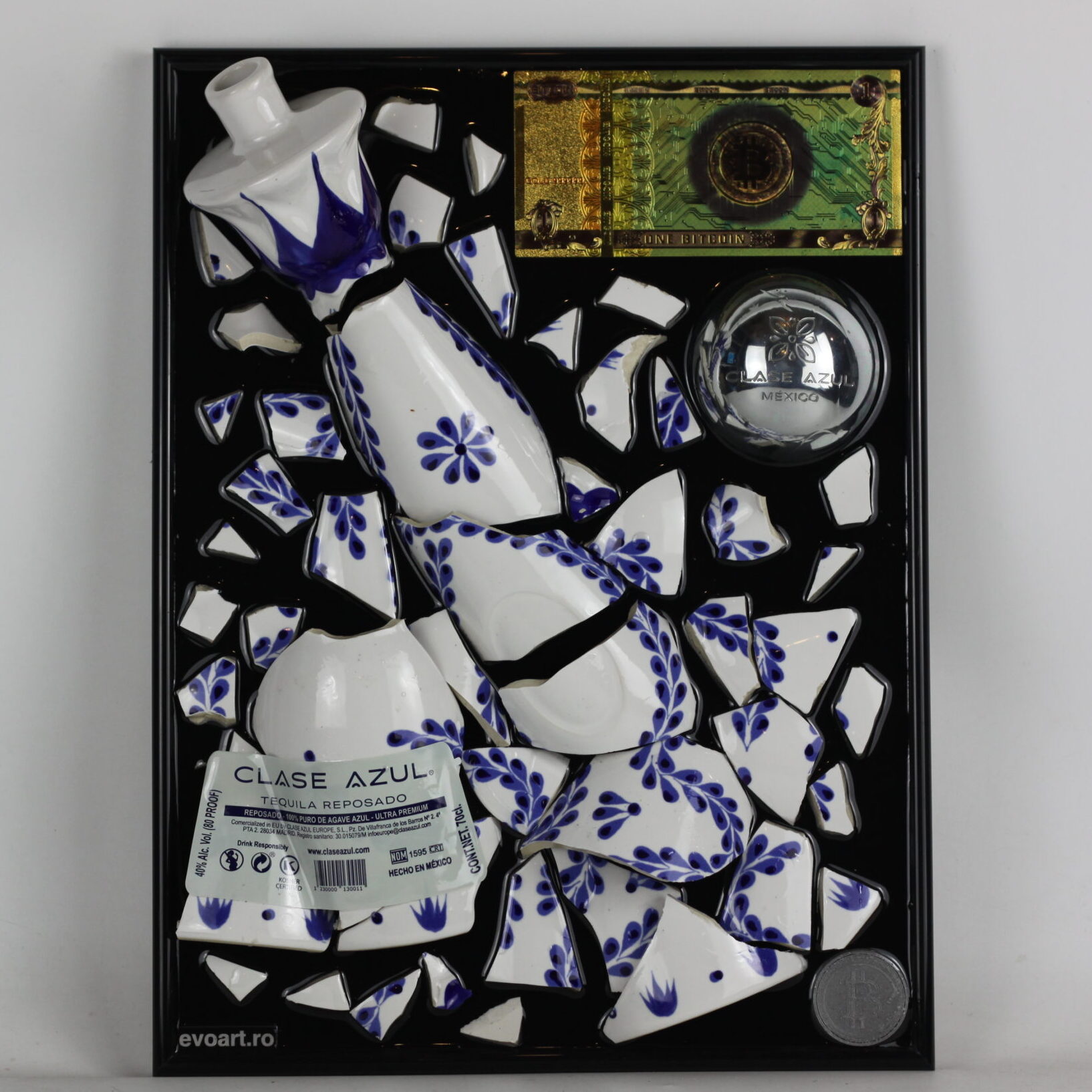 Tablou din sticla de Clase Azul Reposado si bancnota + moneda Bitcoin, creat special pentru Alex Bodi . Fiecare sticla are povestea ei in spate si fiecare tablou este unic.