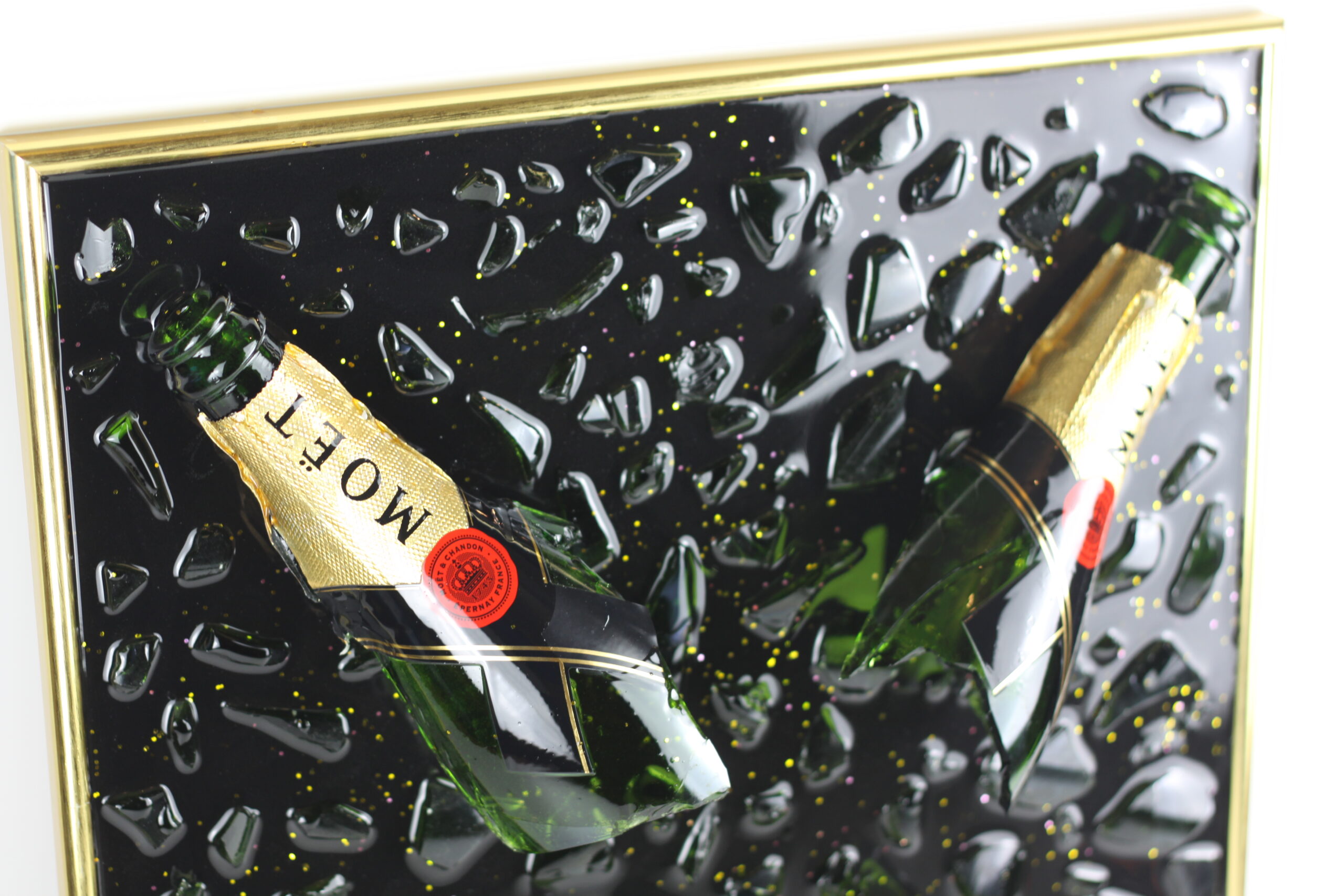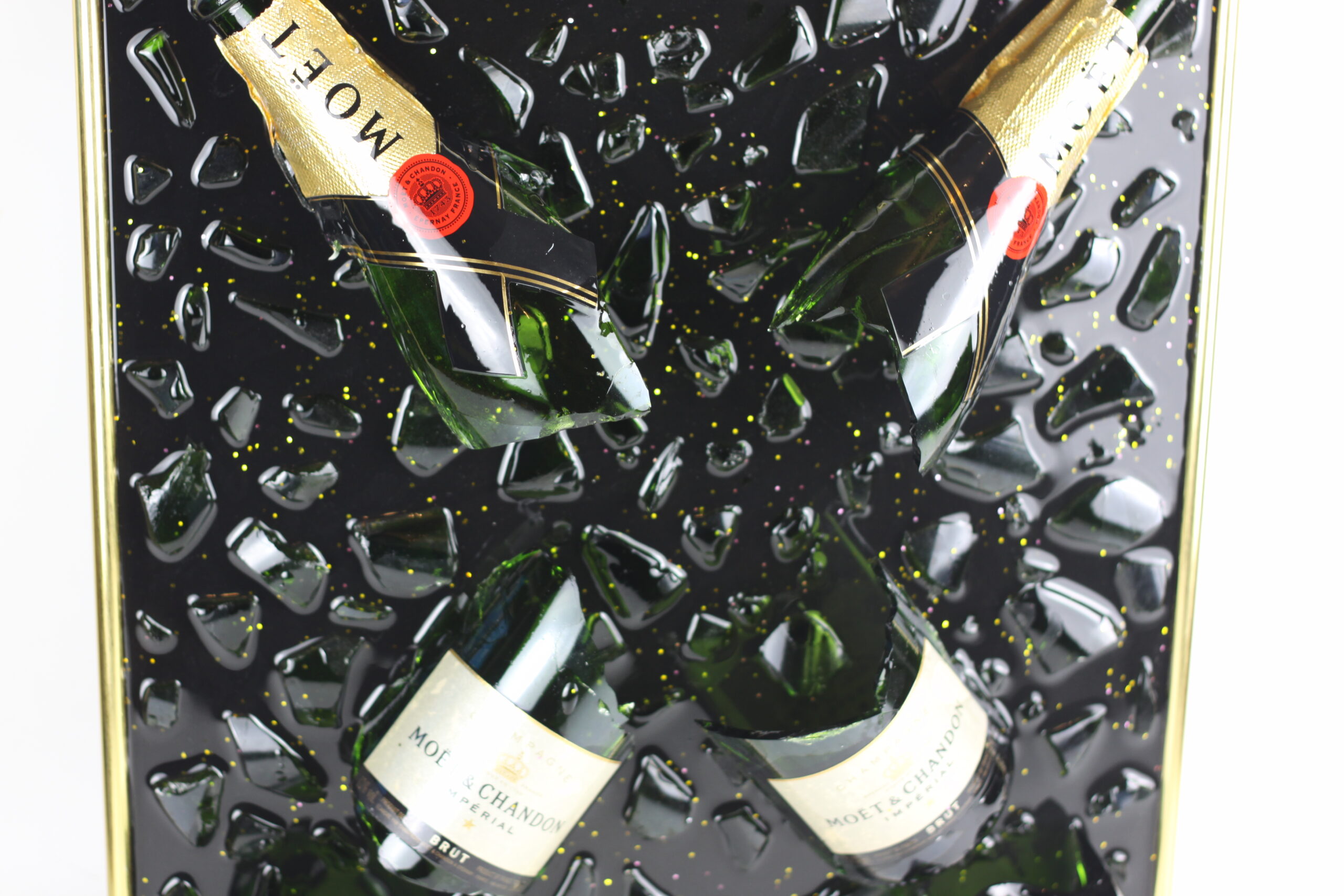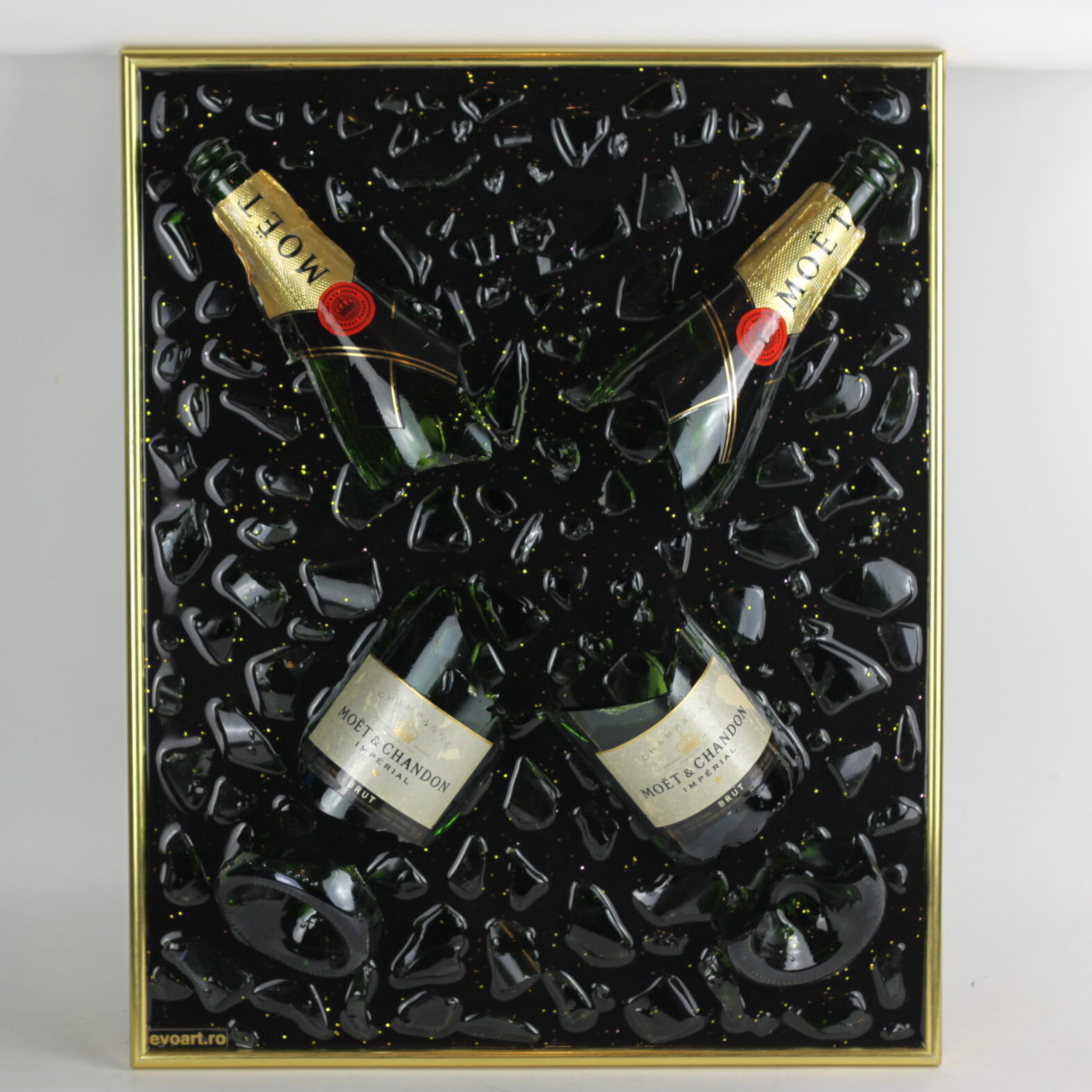 Tablou din 2 sticle de sampanie Moet Imperial + insertii aurii. Fiecare sticla are povestea ei in spate si fiecare tablou este unic.