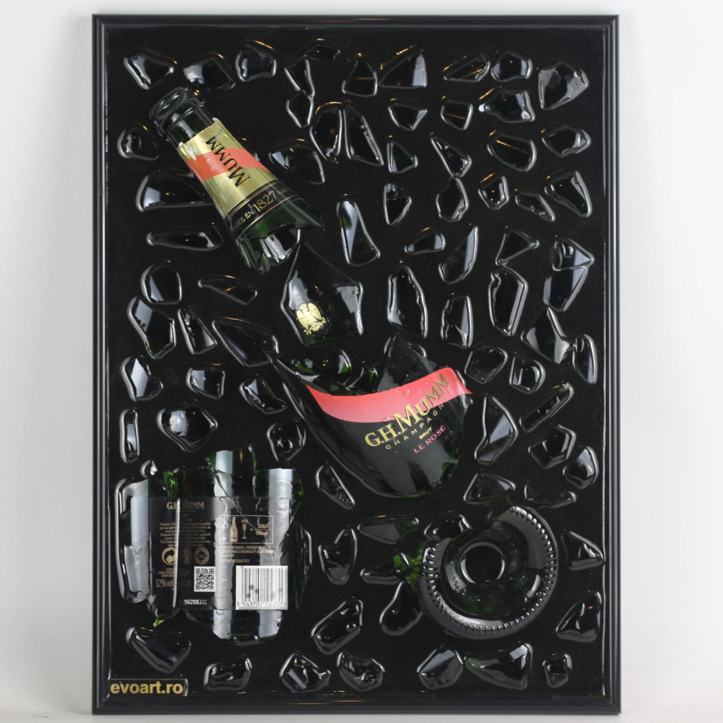 Tablou din sticle de sampanie G.H. Mumm Rose. Fiecare sticla are povestea ei in spate si fiecare tablou este unic.