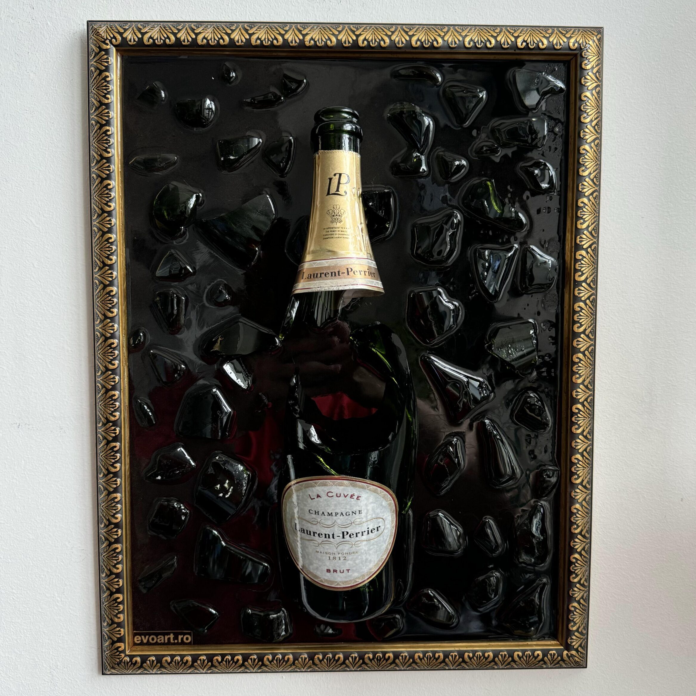 Tablou din sticla de sampanie Laurent Perrier cu rama Baroque asortata. Fiecare sticla are povestea ei in spate si fiecare tablou este unic.