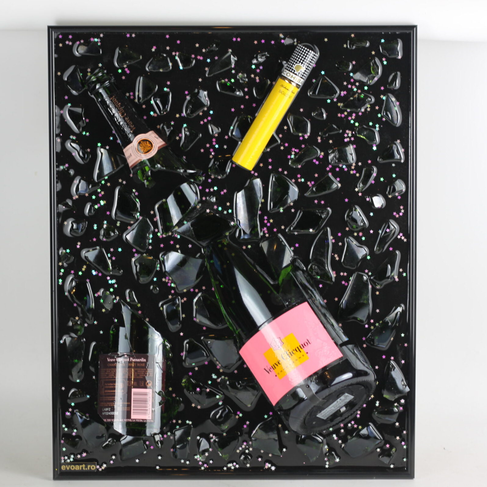 Tablou din sticla de sampanie magnum(1,5L) Veuve Clicquot Rose Neon impreuna cu un trabuc Cohiba + insertii multicolore. Fiecare sticla are povestea ei in spate si fiecare tablou este unic.
