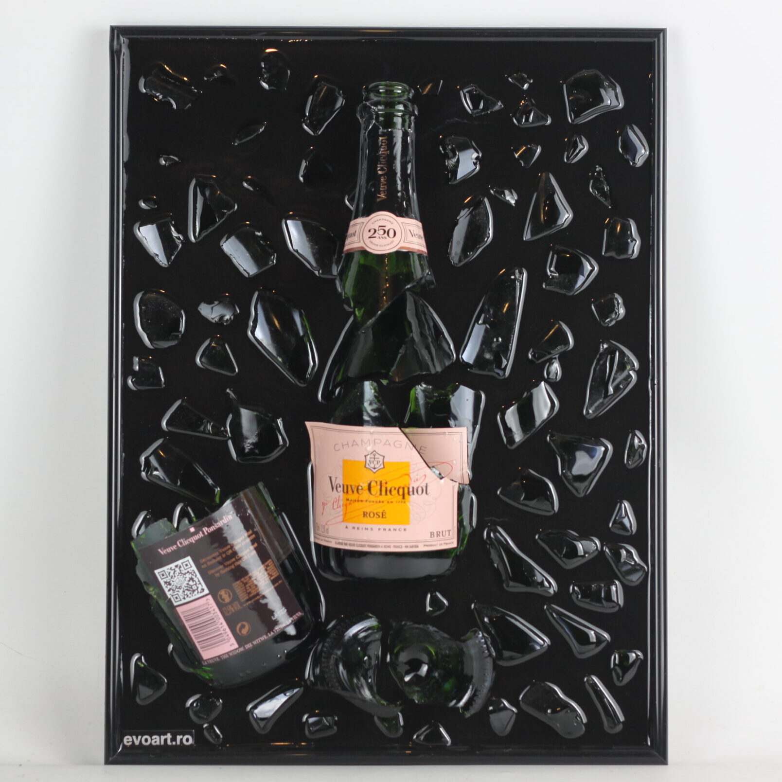 Tablou din sticla de sampanie Veuve Clicquot Rose. Fiecare sticla are povestea ei in spate si fiecare tablou este unic.