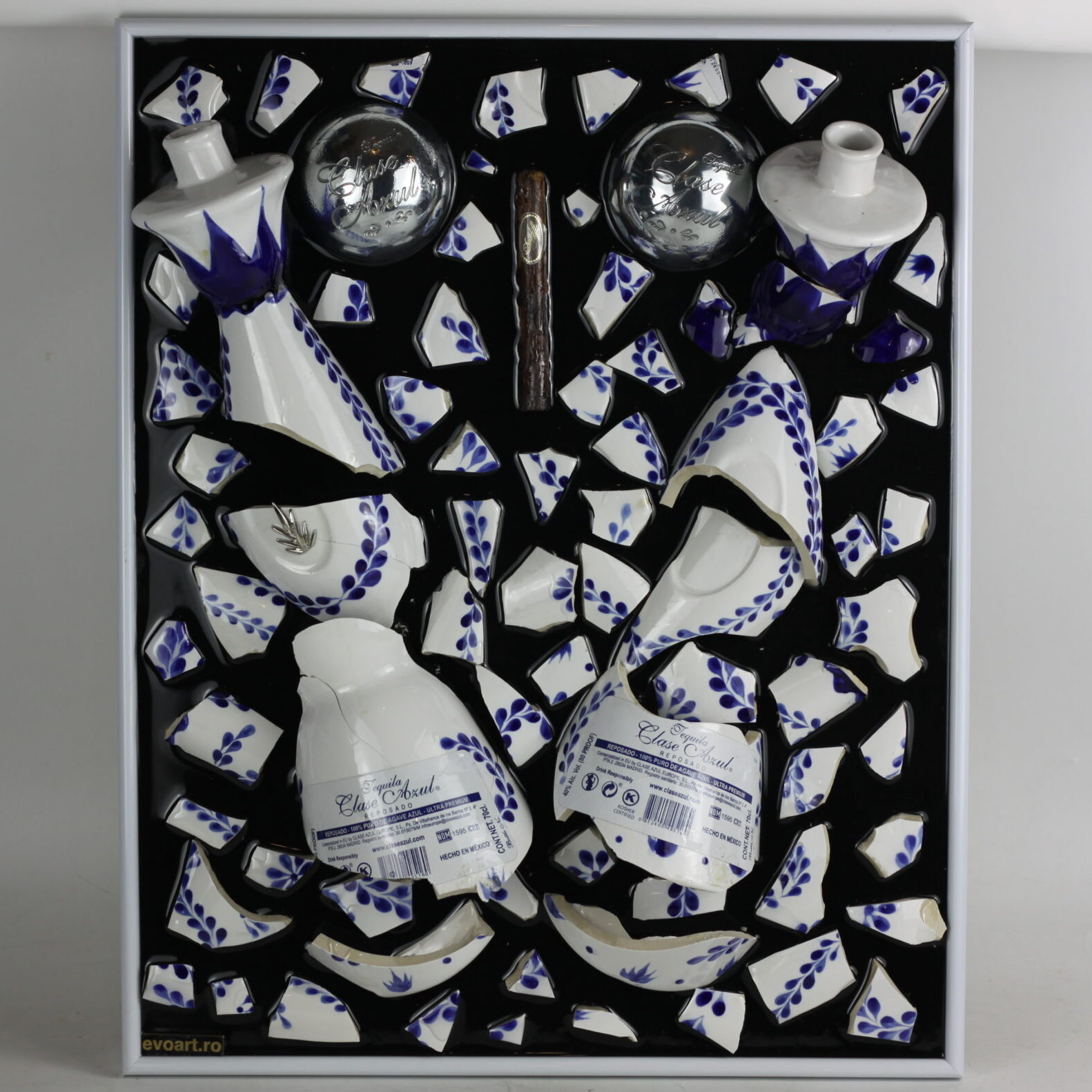 Tablou din 2 sticle de tequila Clase Azul Reposado si un trabuc Davidoff. Fiecare sticla are povestea ei in spate si fiecare tablou este unic.