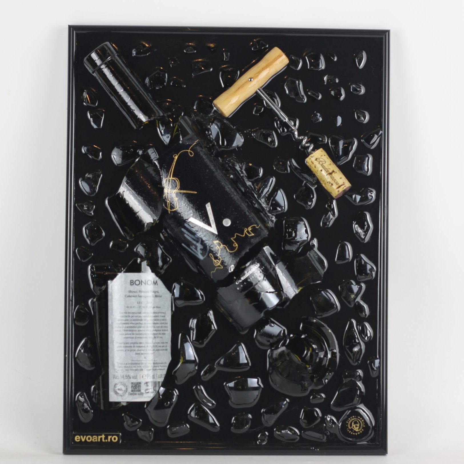 Tablou din sticla de vin rosu BonOm Virgil Iantu Crama Budureasca. Fiecare sticla are povestea ei in spate si fiecare tablou este unic.