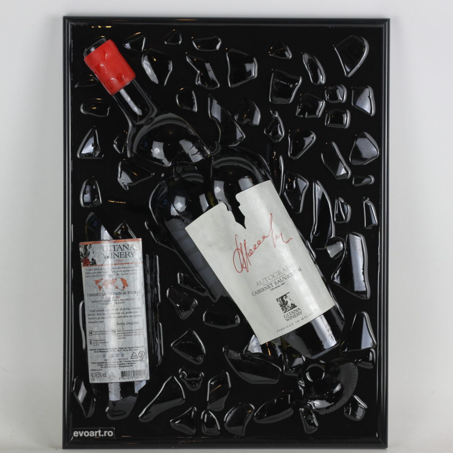 Tablou din sticla de vin rosu Gitana Autograf. Fiecare sticla are povestea ei in spate si fiecare tablou este unic.