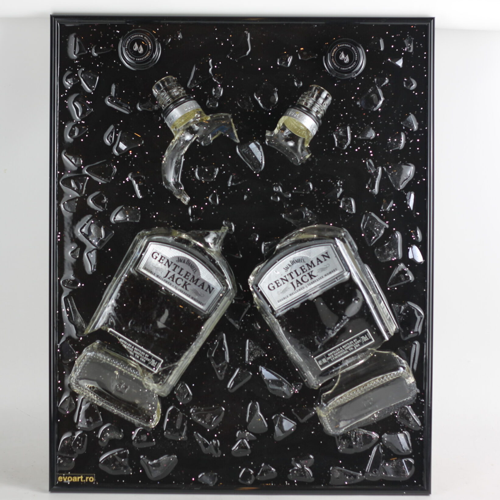 Tablou din 2 sticle de whiskey Gentleman Jack + insertii argintii. Fiecare sticla are povestea ei in spate si fiecare tablou este unic.