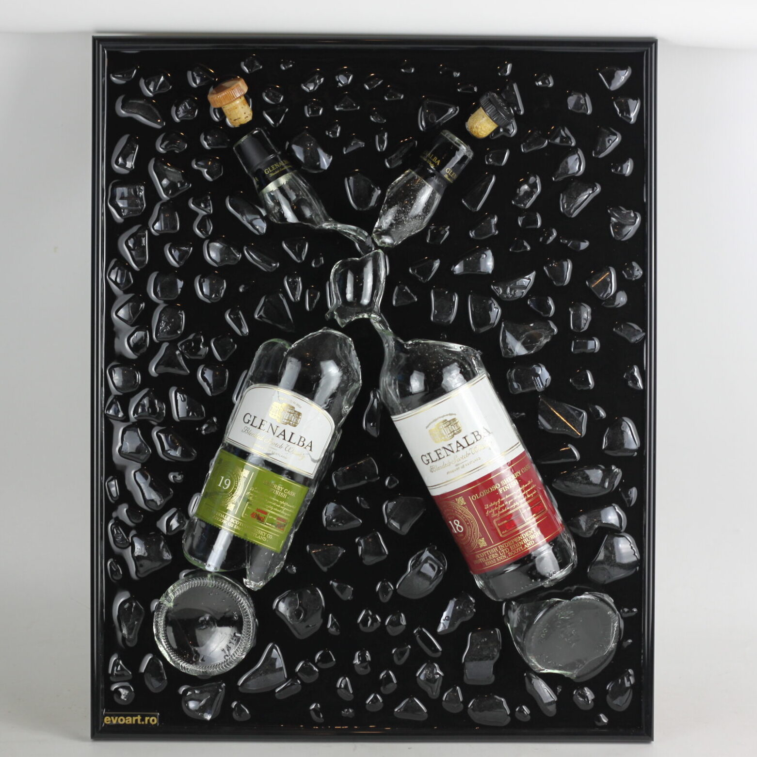 Tablou din 2 sticle de whiskey, Grenalba 18 ani si Grenalba 19 ani. Fiecare sticla are povestea ei in spate si fiecare tablou este unic.