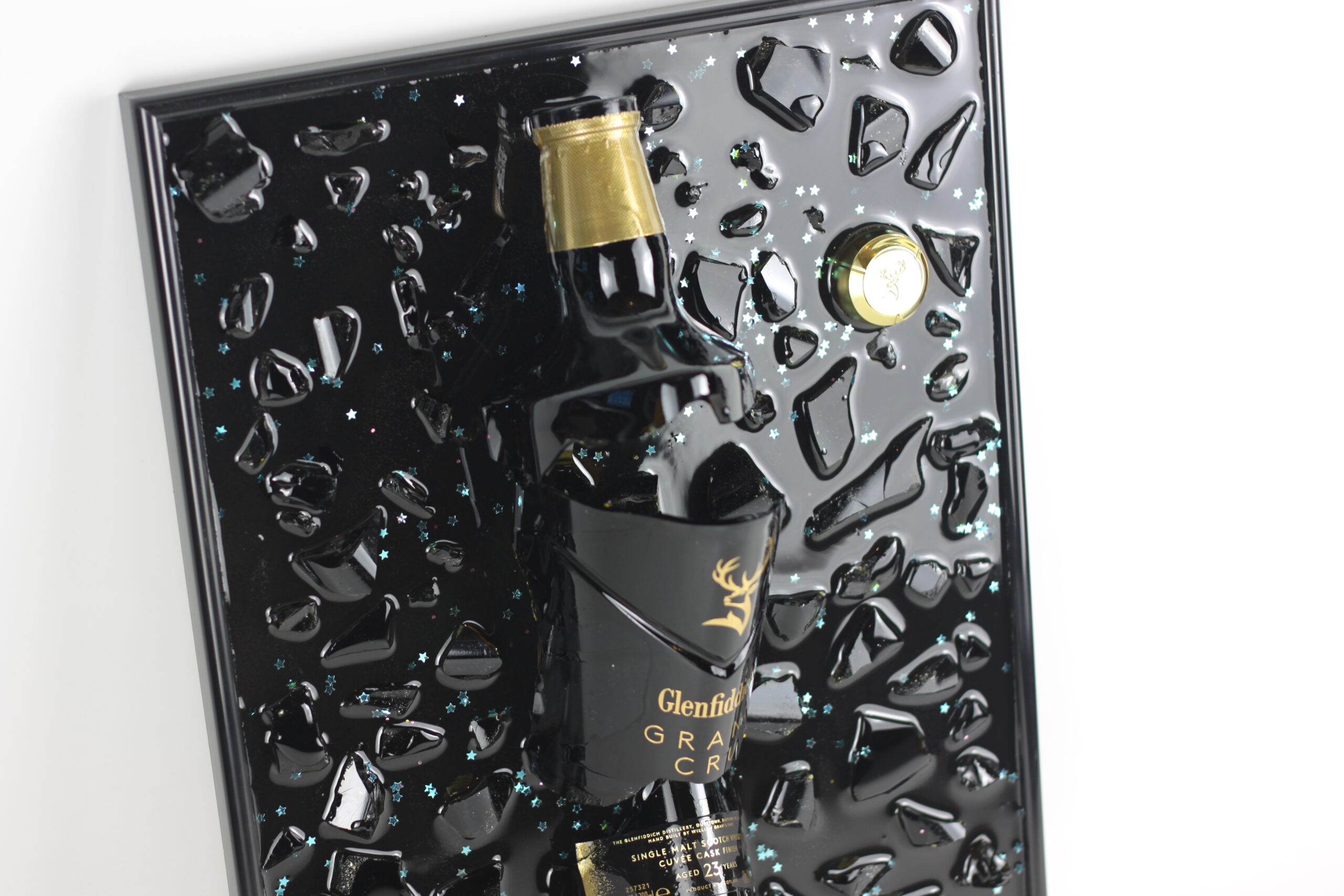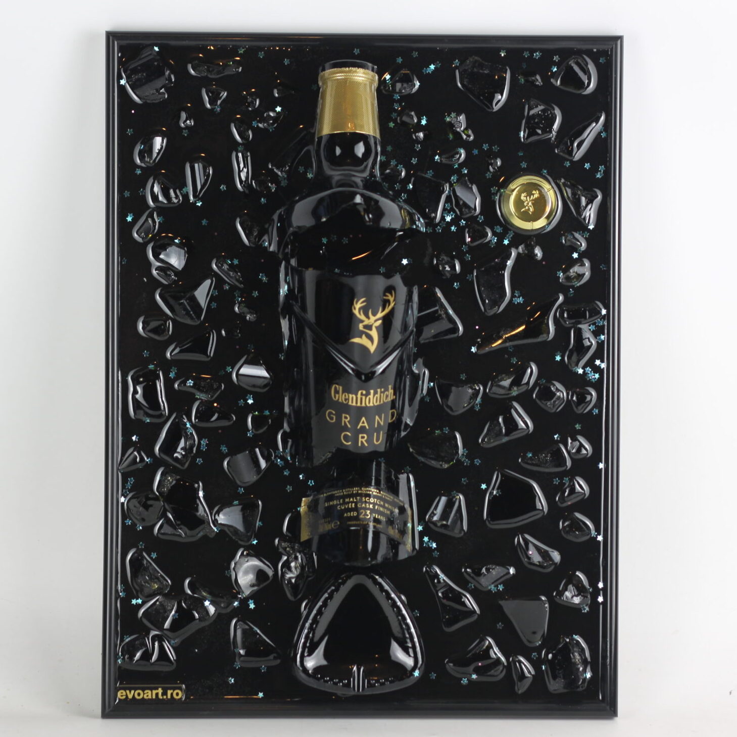 Tablou din sticla de whiskey Glenfiddich Grand Cru + insertii albastre. Fiecare sticla are povestea ei in spate si fiecare tablou este unic.