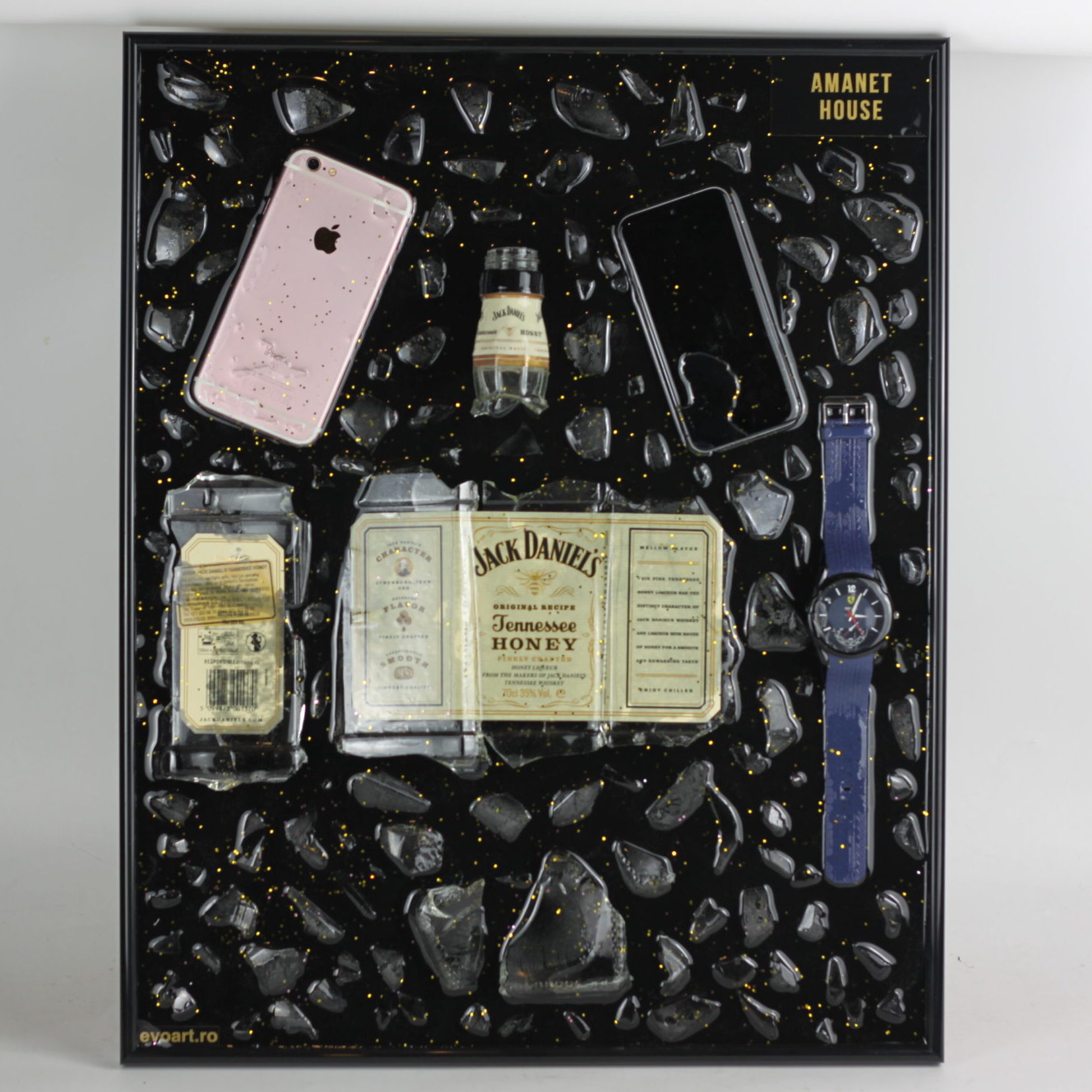 Tablou din sticla de whiskey Jack Daniel`s impreuna cu cateva telefoane si un ceas, creat special pentru Fane de la Amanet House. Fiecare sticla are povestea ei in spate si fiecare tablou este unic.