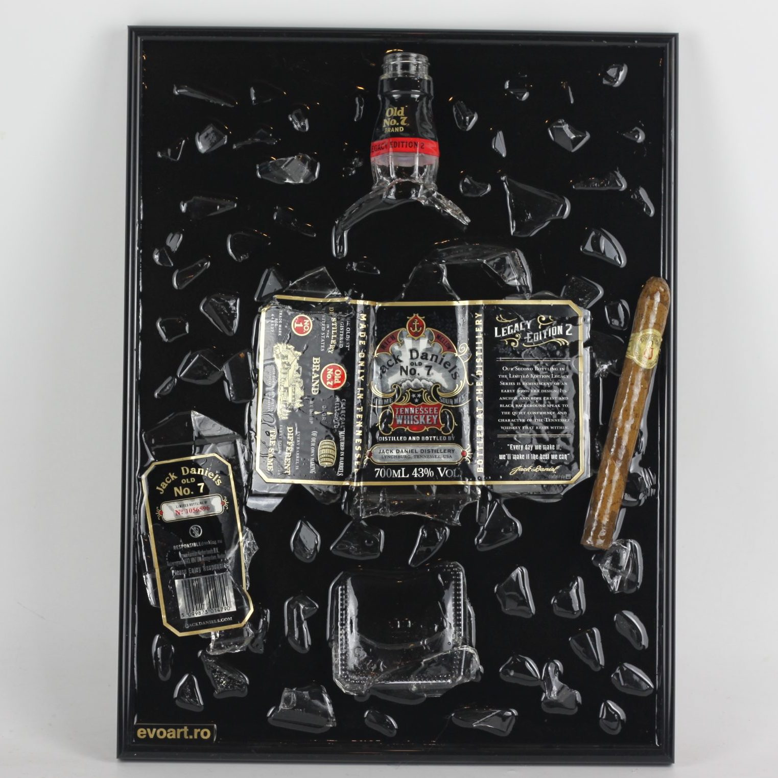 Tablou din sticla de whiskey Jack Daniel`s Legacy Edition 2 cu un trabuc Don Diego Aniversario. Fiecare sticla are povestea ei in spate si fiecare tablou este unic.